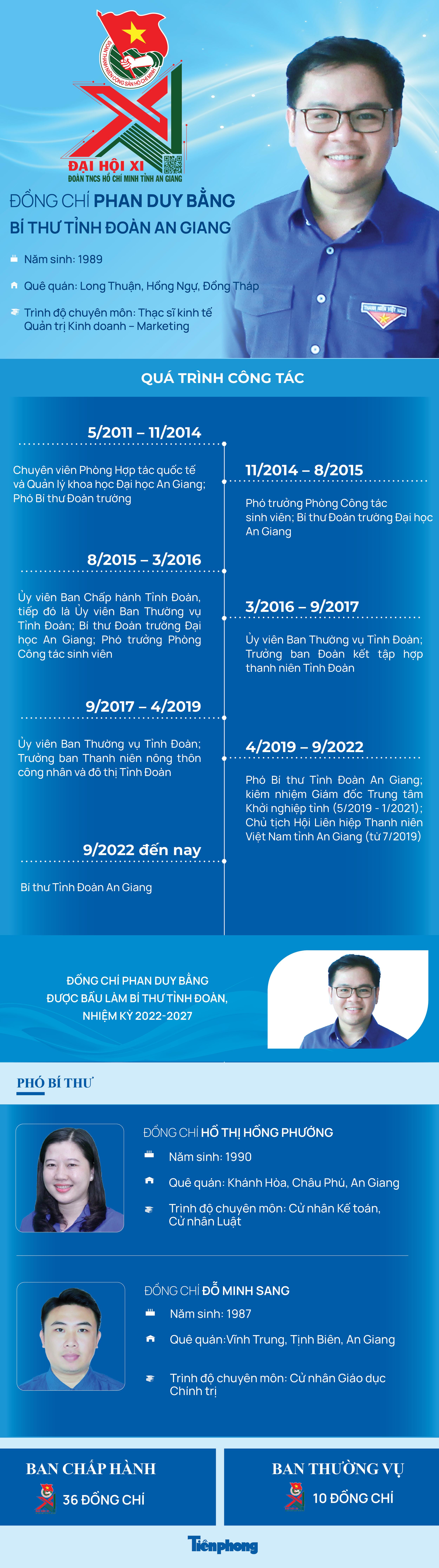 Đại hội đại biểu Đoàn TNCS Hồ Chí Minh tỉnh An Giang lần thứ XI, nhiệm kỳ 2022 – 2027 công bố Ban Chấp hành gồm 36 anh, chị. Anh Phan Duy Bằng - Bí thư Tỉnh Đoàn An Giang khóa X, nhiệm kỳ 2017 - 2022, được bầu làm Bí thư Tỉnh Đoàn khóa XI, nhiệm kỳ 2022 – 2027. Hai Phó Bí thư là anh Đỗ Minh Sang và chị Hồ Thị Hồng Phướng.