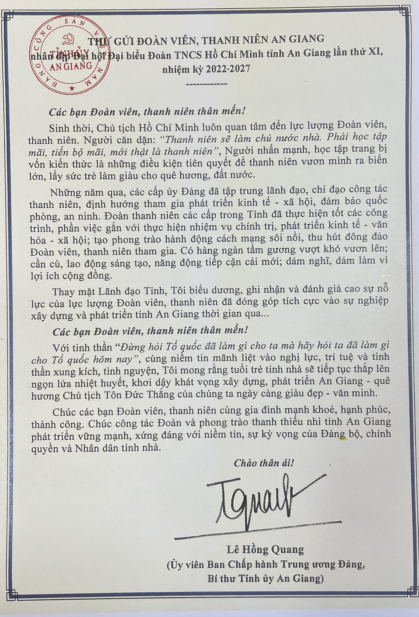 Thư đồng chí Lê Hồng Quang - Ủy viên BCH Trung ương Đảng, Bí thư Tỉnh ủy An Giang gửi đến Đoàn viên, Thanh niên tỉnh nhà nhân dịp Đại hội Đại biểu Đoàn TNCS Hồ Chí Minh tỉnh An Giang lần thứ XI, nhiệm kỳ 2022 - 2027.