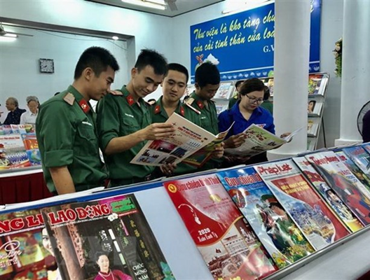 Các chiến sỹ tham quan Hội báo Xuân. (Ảnh: Ánh Tuyết/TTXVN).