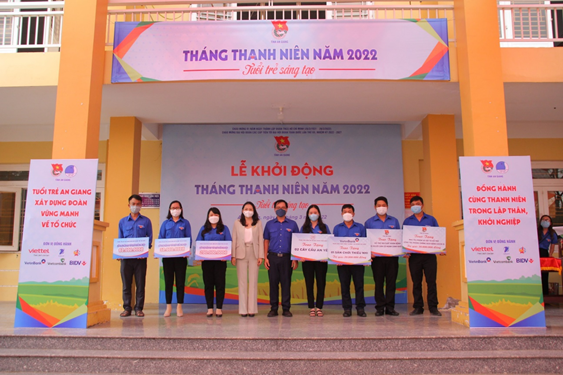 Sáng ngày 01/3, Tỉnh Đoàn An Giang đã long trọng tổ chức Lễ khởi động Tháng Thanh niên An Giang năm 2022 tại thị trấn Óc Eo, huyện Thoại Sơn. Tại buổi lễ, Tỉnh Đoàn đã trao các nguồn lực thực hiện công trình, phần việc với tổng giá trị ước tính gần 1,7 tỷ đồng, cụ thể: hỗ trợ 01 Hồ bơi do BIDV chi nhánh An Giang tài trợ, trị giá 50 triệu đồng; hỗ trợ 02 cây cầu bê tông nông thôn (cầu An Yên) cho Chợ Mới và Thoại Sơn, trị giá 200 triệu đồng; khánh thành 02 cây cầu Hy vọng, trị giá 920 triệu đồng; trao tặng 50 túi an sinh cho người dân, thanh niên có hoàn cảnh khó khăn do Hội Doanh nhân trẻ tỉnh hỗ trợ, trị giá 12,5 triệu đồng; hỗ trợ 03 suất vốn vay cho thanh niên khởi nghiệp từ nguồn Quỹ Hỗ trợ Thanh niên Khởi nghiệp, trị giá 330 triệu đồng; trao tặng 01 sân chơi thiếu nhi, trị giá 20 triệu đồng; tổ chức khám bệnh 300 suất, trị giá 30 triệu đồng; trao tặng nhu yếu phẩm và vật tư hỗ trợ hoạt động phòng, chống dịch Covid-19 (đồ bảo hộ, khẩu trang y tế, xà bông rửa tay Lifebuoy…), trị giá 50 triệu đồng; trao tặng 10 thẻ BHYT cho gia đình khó khăn, và 15 suất quà an sinh cho Gia đình chính sách, trị giá gần 20 triệu đồng; trao tặng 1.000 lá cờ tổ quốc hưởng ứng Tháng Thanh niên và Tháng ba biên giới năm 2022 do Viettel An Giang hỗ trợ, trị giá 20 triệu đồng; VNPT An Giang hỗ trợ 260 bandroll tuyên truyền Tháng Thanh niên năm 2022, trị giá 50 triệu đồng. Đối với cấp huyện, trao tặng 01 sân chơi cho thiếu nhi; Trồng tuyến đường cây Kèn Hồng với chiều dài 2km; ra quân diễu hành tuyên truyền An toàn giao thông với sự tham gia của hơn 30 đoàn viên, thanh niên; khánh thành tuyến đường thắp sáng kênh vành đai với 18 đèn năng lượng mặt trời; trao 01 suất vốn hỗ trợ TN thoát nghèo; trao 06 suất học bổng đỡ đầu học sinh nghèo; trao 20 phần quà an sinh cho hộ gia đình khó khăn; Tổng kinh phí cấp huyện gần 100 triệu đồng.