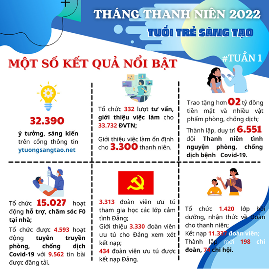 Lễ khởi động Tháng Thanh niên 2022 cấp Trung ương được tổ chức tại Hà Nội với hàng loạt hoạt động xung kích, tình nguyện bảo đảm an sinh xã hội như: khánh thành “Hàng cây thanh niên”; thăm, tặng quà các Mẹ Việt Nam Anh hùng; khởi công xây dựng “Ngôi nhà 100 đồng”, “Nhà khăn quàng đỏ”, “Nhà nhân ái”; trao quà tặng học sinh hoàn cảnh khó khăn; thăm, trao quà tặng thanh niên công nhân; ra mắt Mạng lưới 16 Câu lạc bộ “Đổi mới sáng tạo và chuyển đổi số” tại các trường đại học, học viện, Hội Sinh viên và Thanh niên Việt Nam tại nước ngoài; Triển lãm sáng tạo “Tri thức trẻ Thanh niên”...