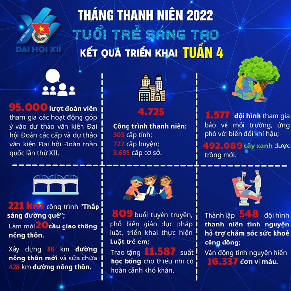 Trong tuần 04, các cấp bộ Đoàn đã triển khai thực hiện 4.725 công trình thanh niên các cấp (303 công trình thanh niên cấp tỉnh, 727 công trình thanh niên cấp huyện). Các tỉnh, thành đoàn đã thành lập 1.577 đội hình tham gia bảo vệ môi trường, ứng phó với biến đổi khí hậu với gần 25.000 lượt đoàn viên, thanh niên tham gia.
