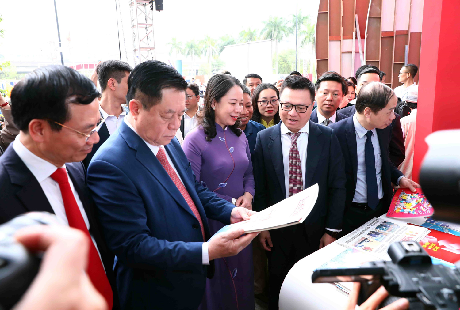 Bí thư Trung ương Đảng, Trưởng Ban Tuyên giáo Trung ương Nguyễn Trọng Nghĩa cùng các đại biểu tham quan các sản phẩm báo chí trưng bày tại Hội Báo toàn quốc năm 2023_Ảnh: TTXVN