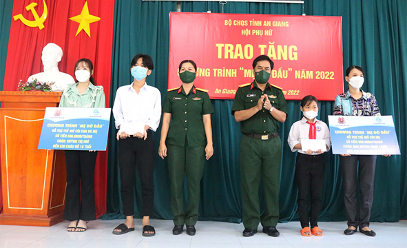 “Từ nay đến khi tròn 18 tuổi, Huỳnh Thị Nhí và em Mai Huỳnh Nhựt Long (ngụ xã Vĩnh Thành, huyện Châu Thành) được nhận sinh hoạt phí 6 triệu đồng/năm, vật chất học tập 1 triệu đồng/năm, từ nguồn vận động, đóng góp của hội viên, đoàn viên trong Bộ Chỉ huy Quân sự tỉnh. Hoạt động nhằm hưởng ứng chương trình “Mẹ đỡ đầu” do Trung ương Hội Liên hiệp Phụ nữ Việt Nam phát động, chia sẻ nỗi mất mát và giúp các em có điều kiện phát triển toàn diện” - thượng úy Huỳnh Thị Quỳnh Hạnh (Chủ tịch Hội Phụ nữ Bộ Chỉ huy Quân sự tỉnh) chia sẻ.