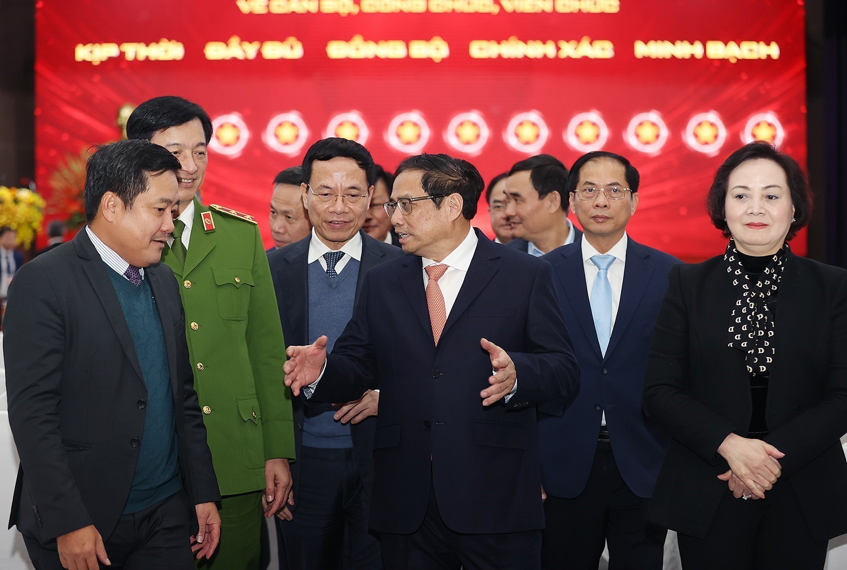 Ủy viên Bộ Chính trị, Thủ tướng Chính phủ Phạm Minh Chính với các đại biểu dự Hội nghị trực tuyến toàn quốc tổng kết công tác năm 2022 và triển khai nhiệm vụ năm 2023 của ngành nội vụ_Ảnh: TTXVN
