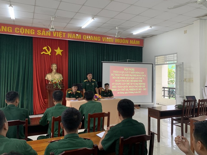 Thực hiện Kế hoạch công tác Đoàn và phong trào thanh niên năm 2022 và tổ chức các hoạt động thiết thực chào mừng Đại hội Đoàn các cấp, Đoàn Thanh niên Bổ chỉ huy Quân sự tỉnh đã tổ chức 02 hội nghị đóng góp văn kiện cho 62 lượt cán bộ, đoàn viên tham gia đóng góp dự thảo văn kiện Đại hội Đoàn toàn quốc lần thứ XII, nhiệm kỳ 2022 - 2027, Điều lệ Đoàn; dự thảo văn kiện Đại hội Đại biểu Đoàn TNCS HCM tỉnh An Giang lần thứ XI, nhiệm kỳ 2022 - 2027; dự thảo văn kiện Đoàn TNCS Hồ Chí Minh Bộ Chỉ huy Quân sự tỉnh An Giang lần thứ VI, nhiệm kỳ 2022 - 2027.