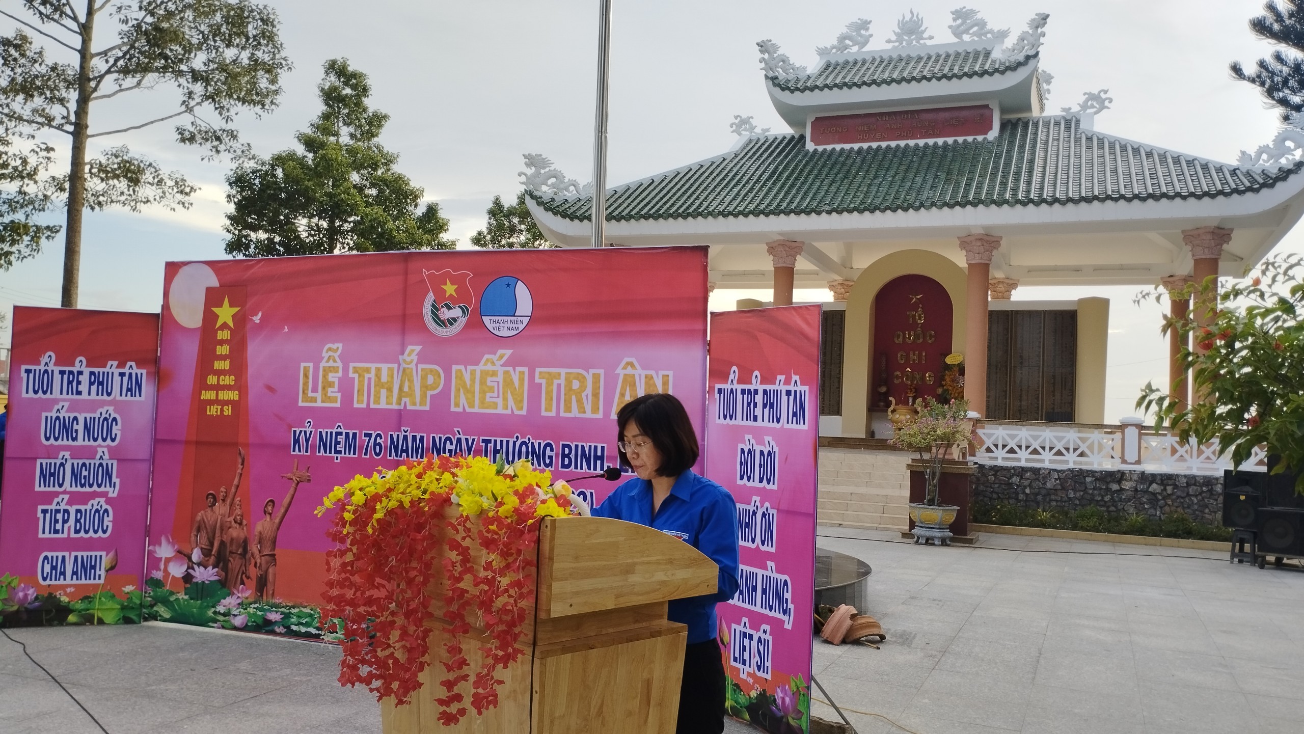 Trước đó, vào tối ngày 26/7/2023 tại Nghĩa trang Liệt sĩ huyện, Huyện Đoàn - Ủy ban Hội LHTN Việt Nam huyện Phú Tân đã phối hợp tổ chức Lễ Thắp nến tri ân với sự tham gia của gần 400 ĐVTN, HS, hội viên Hội Cựu chiến binh trên địa bàn huyện. Trong không khí thiêng liêng, xúc động, tuổi trẻ huyện Phú Tân đã dâng hương và thắp những ngọn nến tri ân bày tỏ lòng thành kính, biết ơn sâu sắc đến các anh hùng liệt sĩ đã hy sinh quên mình vì độc lập tự do của dân tộc. Trước anh linh các anh hùng liệt sĩ, tuổi trẻ Phú Tân nguyện sẽ ra sức thi đua học tập, rèn luyện, lao động sản xuất; phát huy tinh thần sáng tạo, tích cực tham gia các phong trào thi đua yêu nước, xung kích tình nguyện xây dựng và bảo vệ Tổ quốc, góp phần xây dựng quê hương Phú Tân ngày càng giàu mạnh, văn minh.