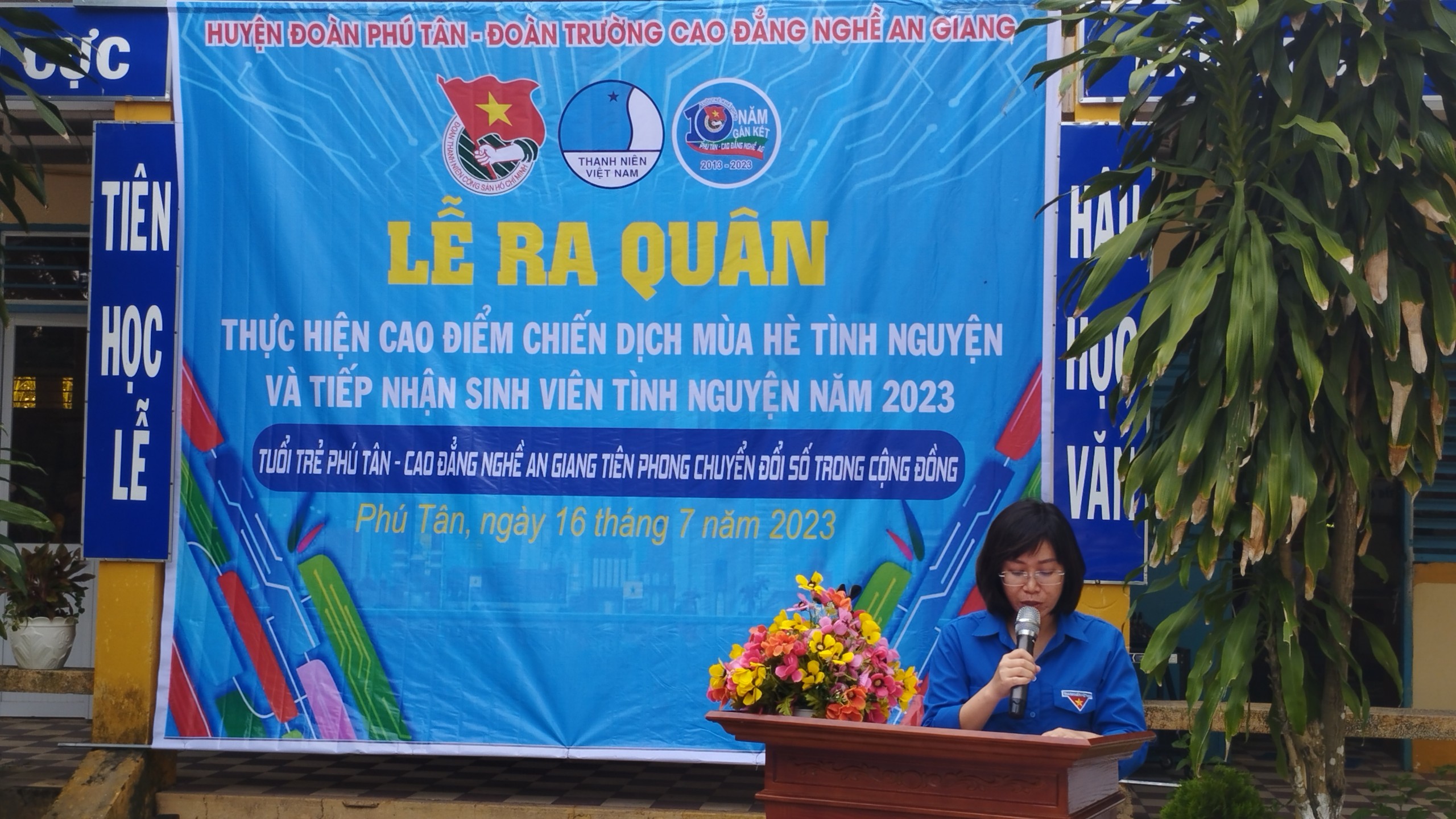 Sáng ngày 16/7/2023 tại trường Tiểu học A Hòa Lạc, Ban Thường vụ Huyện Đoàn Phú Tân phối hợp Đoàn trường Cao đẳng Nghề An Giang tổ chức Lễ ra quân cao điểm Chiến dịch Mùa hè tình nguyện và tiếp nhận sinh viên tình nguyện về hoạt động tại địa phương, với sự tham dự của hơn 250 ĐVTN, học sinh, sinh viên tình nguyện và người dân.