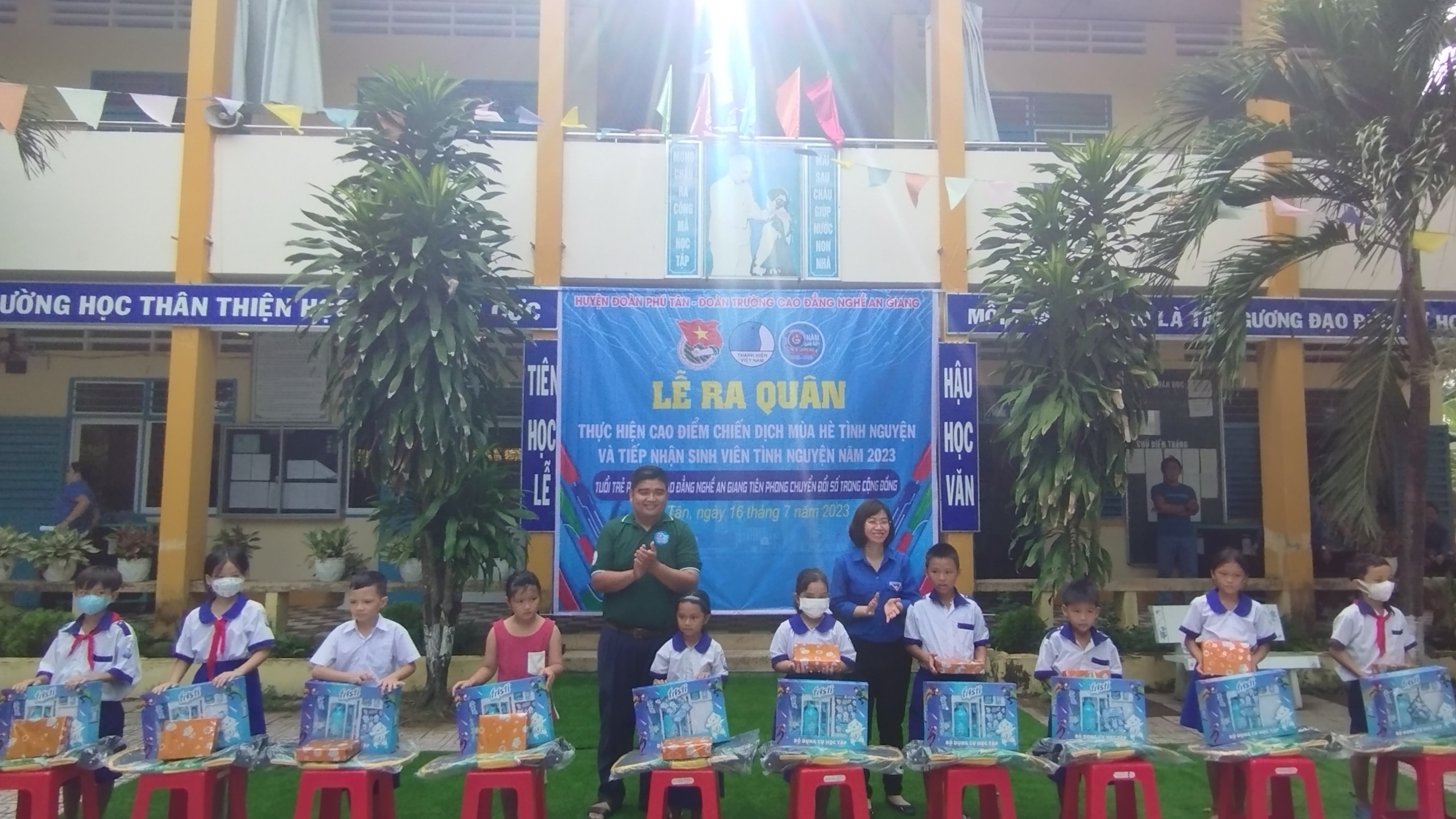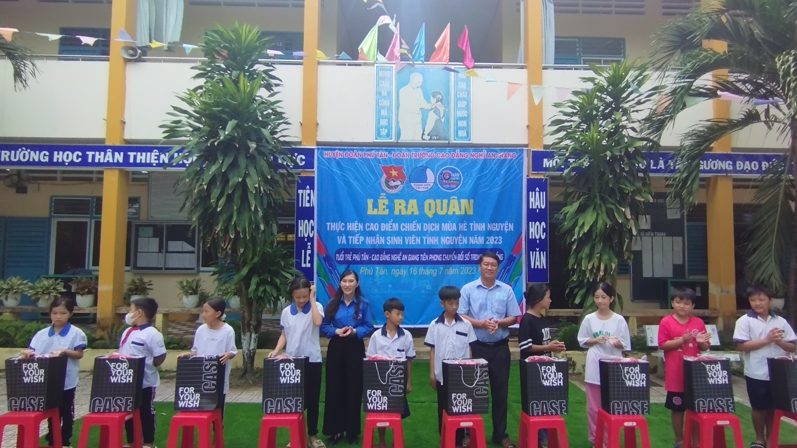 Tại buổi lễ, Ban Thường vụ Huyện Đoàn, Đoàn trường Cao đẳng Nghề An Giang, Hội Bảo trợ NTT - TMC - BNN huyện, các cơ sở Đoàn và Ban Giám hiệu trường Tiểu học A Hòa Lạc đã vận động mạnh thường quân trao tặng 150 phần quà cho người dân, học sinh có hoàn cảnh khó khăn; trao bảng tượng trưng tặng 03 căn nhà nhân ái cho thanh niên khó khăn về nhà ở. Dịp này, Đoàn trường Cao đẳng Nghề An Giang đã trao bảng tượng trưng hỗ trợ các nguồn lực thực hiện Chiến dịch Mùa hè tình nguyện cho Huyện Đoàn Phú Tân với số tiền 25 triệu đồng và 1.000 chiếc khăn quàng đỏ. Ban Thường vụ Huyện Đoàn còn trao tặng 01 phần quà cho Đội hình sinh viên tình nguyện trường Cao đẳng Nghề An Giang.