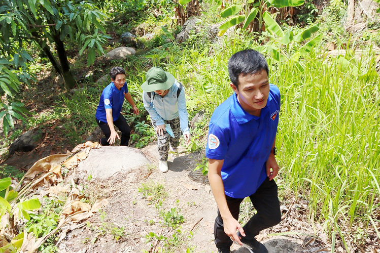 Đoàn phải lội bộ theo lối mòn hoặc qua các bậc thang, với tổng chiều dài hơn 1,2 km để đến các hang căn cứ