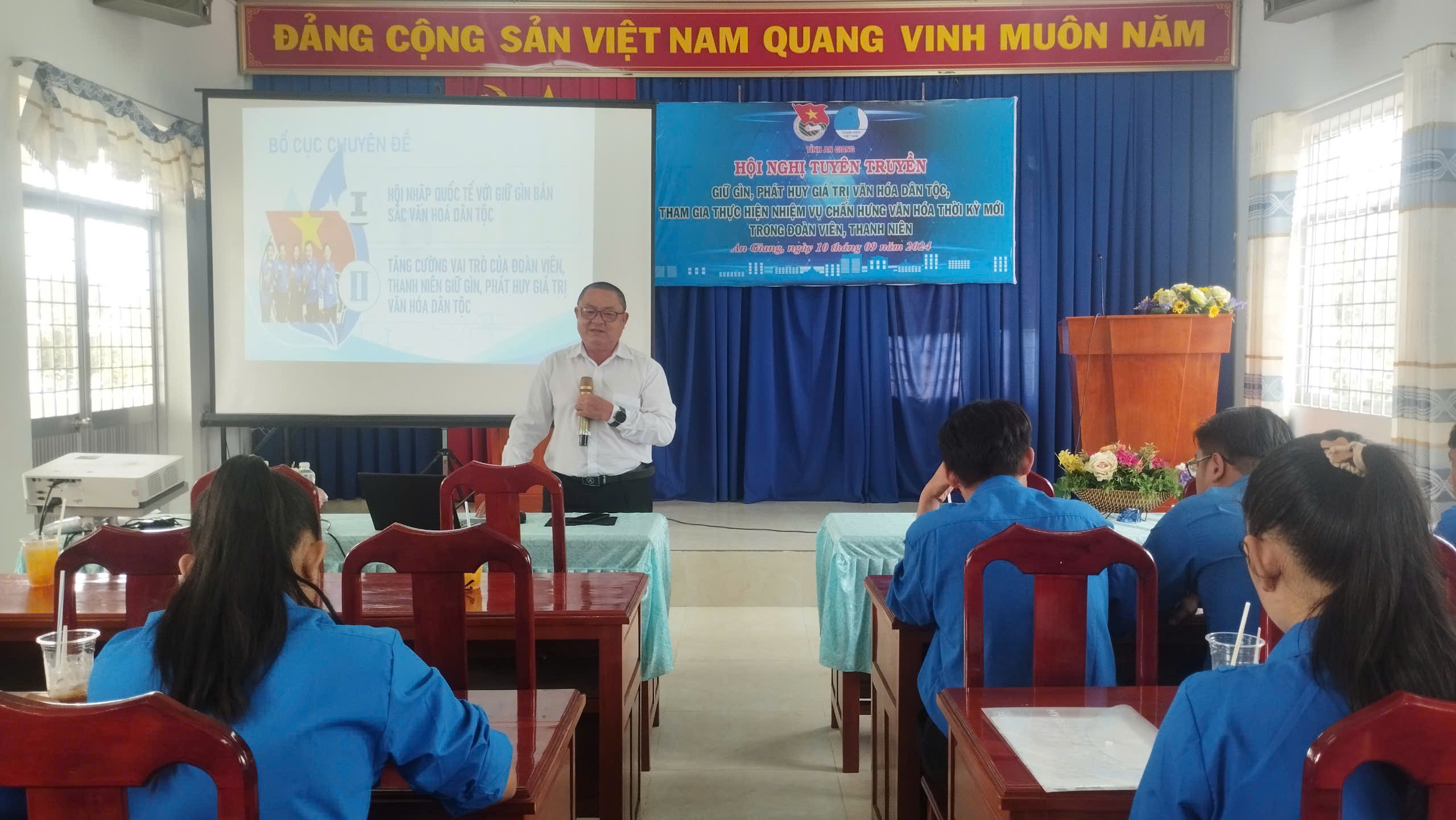 Ngày 10/9/2024, Tỉnh Đoàn An Giang tổ chức Hội nghị tuyên truyền giữ gìn, phát huy giá trị văn hoá dân tộc, tham gia thực hiện nhiệm vụ chấn hưng văn hoá thời kỳ mới trong đoàn viên, thanh niên. Hội nghị được trực tuyến đến 18/18 điểm cầu trong toàn tỉnh, với hơn 1.500 Cán bộ, Đoàn viên, thanh niên tham gia.