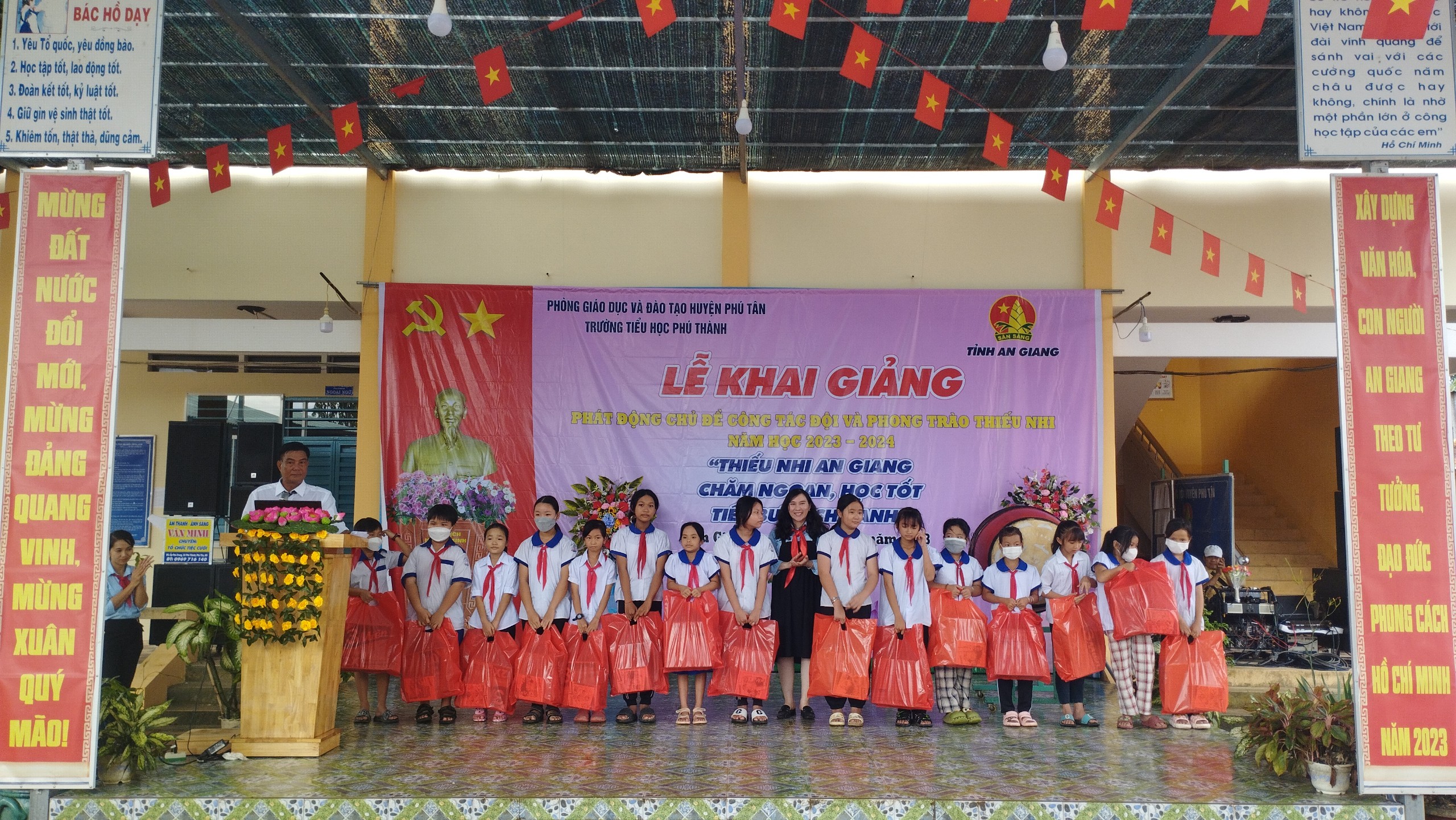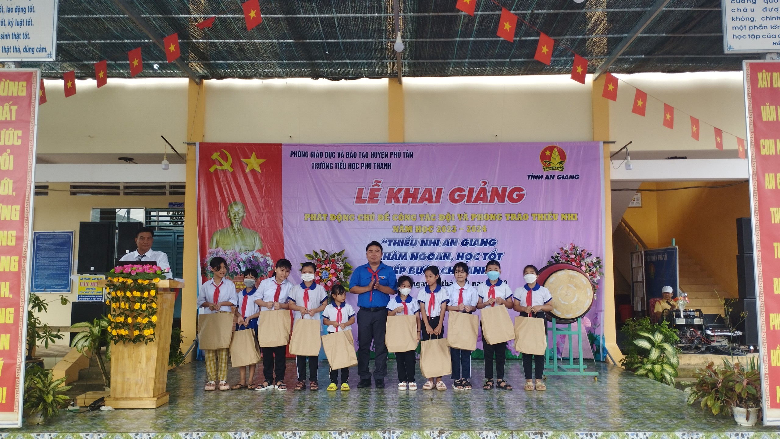 Dịp này, Hội đồng Đội tỉnh An Giang đã trao tặng trang thiết bị Đội cho trường Tiểu học Phú Thành gồm: 01 bộ trống Đội, 05 bộ trang phục nghi thức Đội, 300 quyển tập, 50 áo trắng học sinh và 10 phần quà cho các em học sinh có hoàn cảnh khó khăn từ nguồn tài trợ của Công ty TNHH MTV Xổ số kiến thiết An Giang. Riêng Hội đồng Đội huyện đã trao tặng công trình măng non “Khăn quàng trao em” cho Liên Đội trường Tiểu học Phú Thành và 15 phần quà học tập, nhu yếu phẩm cho các em học sinh vượt khó, học giỏi để tiếp thêm điều kiện các em đến trường. Ngoài ra, Ban Giám hiệu nhà trường còn vận động Công ty Cổ phần Tập đoàn Lộc Trời trao tặng 60 bộ sách giáo khoa và 600 quyển tập cho các em học sinh có hoàn cảnh khó khăn của trường. Sau lễ, các em học sinh được tham gia các hoạt động như: trải nghiệm bắn tên lửa nước; tham quan thư viện thân thiện và các gian hàng triển lãm sách, góc truyền thông; tham gia các trò chơi dân gian như kéo co, nhảy bao bố, đá bóng vào khung thành… Cùng ngày, được sự ủy quyền của Hội đồng Đội tỉnh An Giang, Hội đồng Đội huyện đã phối hợp trao học bổng Quỹ Doraemon năm học 2023 - 2024 cho 03 em học sinh tiêu biểu có hoàn cảnh khó khăn thuộc trường THCS Phú Hiệp, THCS Phú Xuân và THCS&THPT Phú Tân.