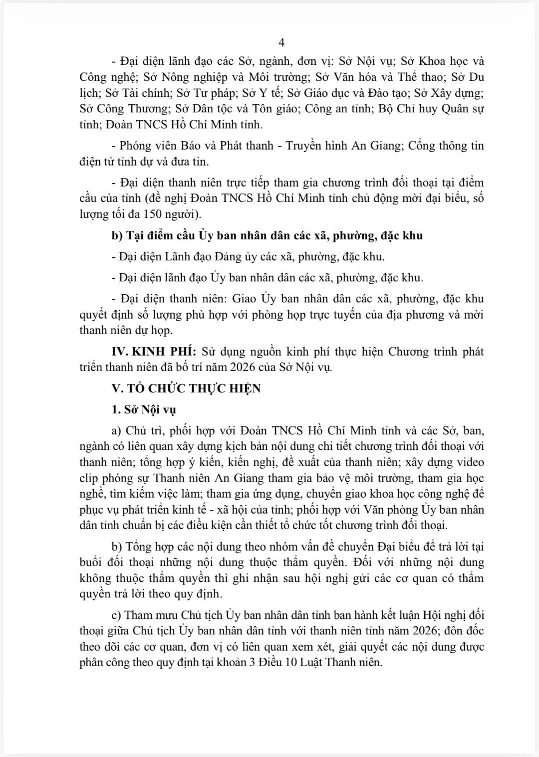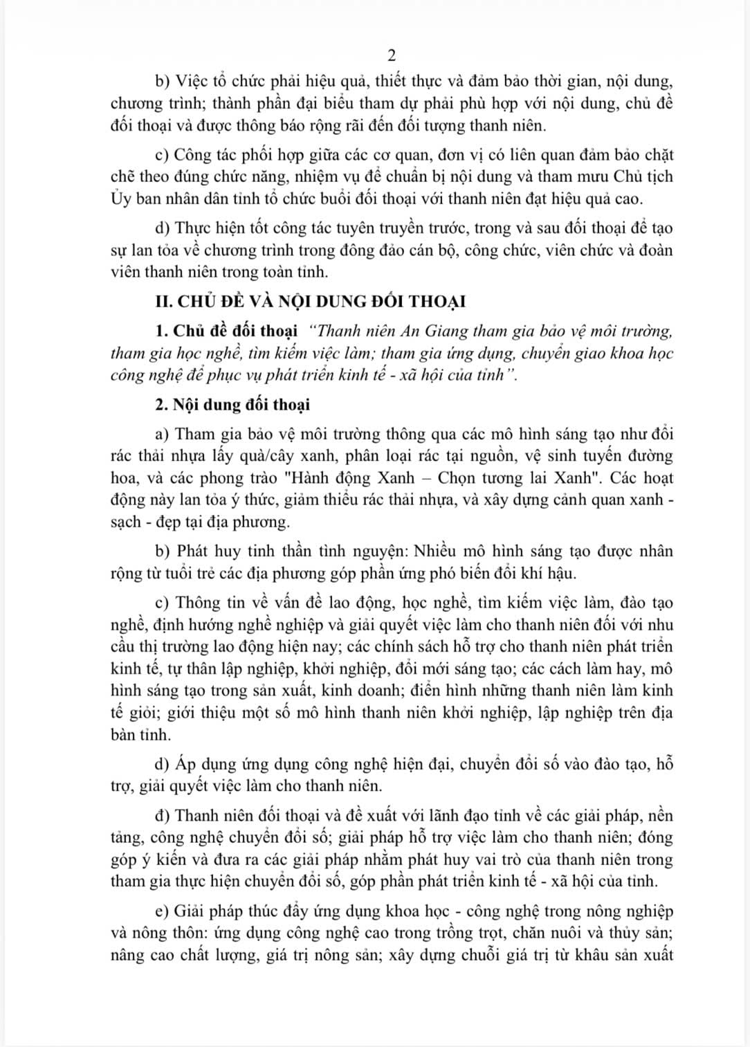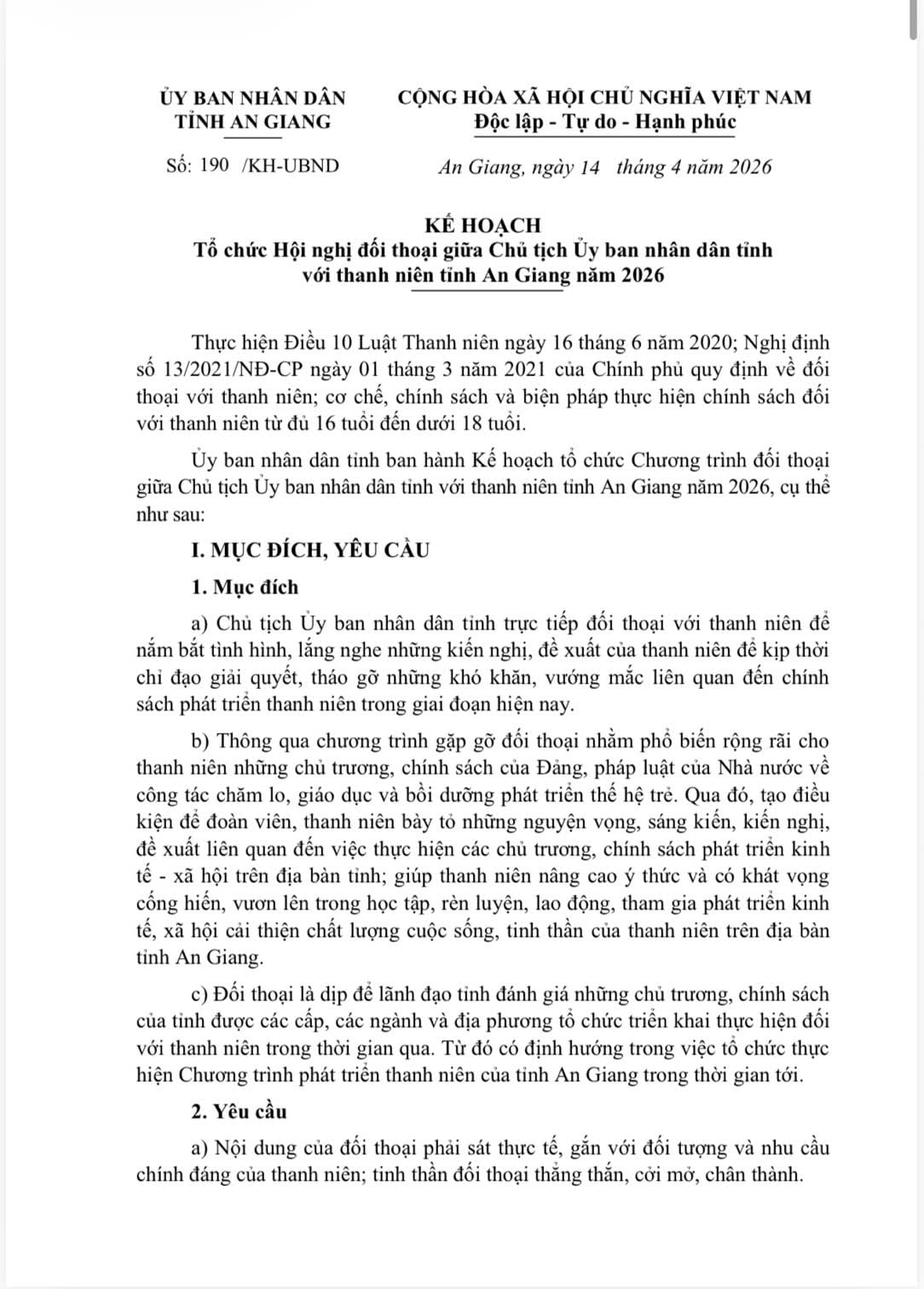 Ngày 14/4/2026, UBND tỉnh An Giang ban hành Kế hoạch số 190/KH-UBND về việc Tổ chức Hội nghị đối thoại giữa Chủ tịch Ủy ban nhân dân tỉnh với thanh niên tỉnh An Giang năm 2026.