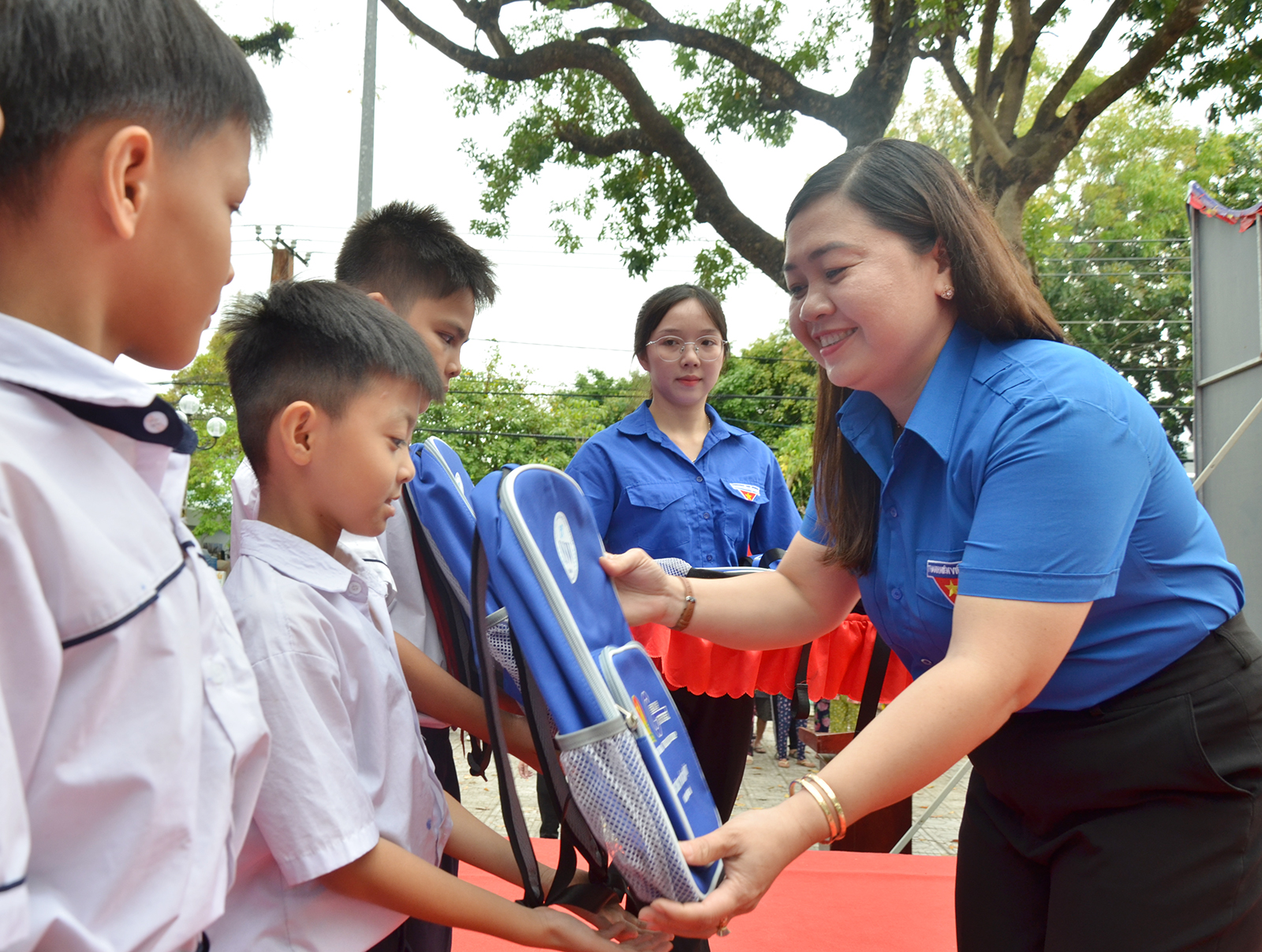Phó Bí thư Thường trực Tỉnh đoàn An Giang Thị Phương Hồng tặng quà cho các học sinh