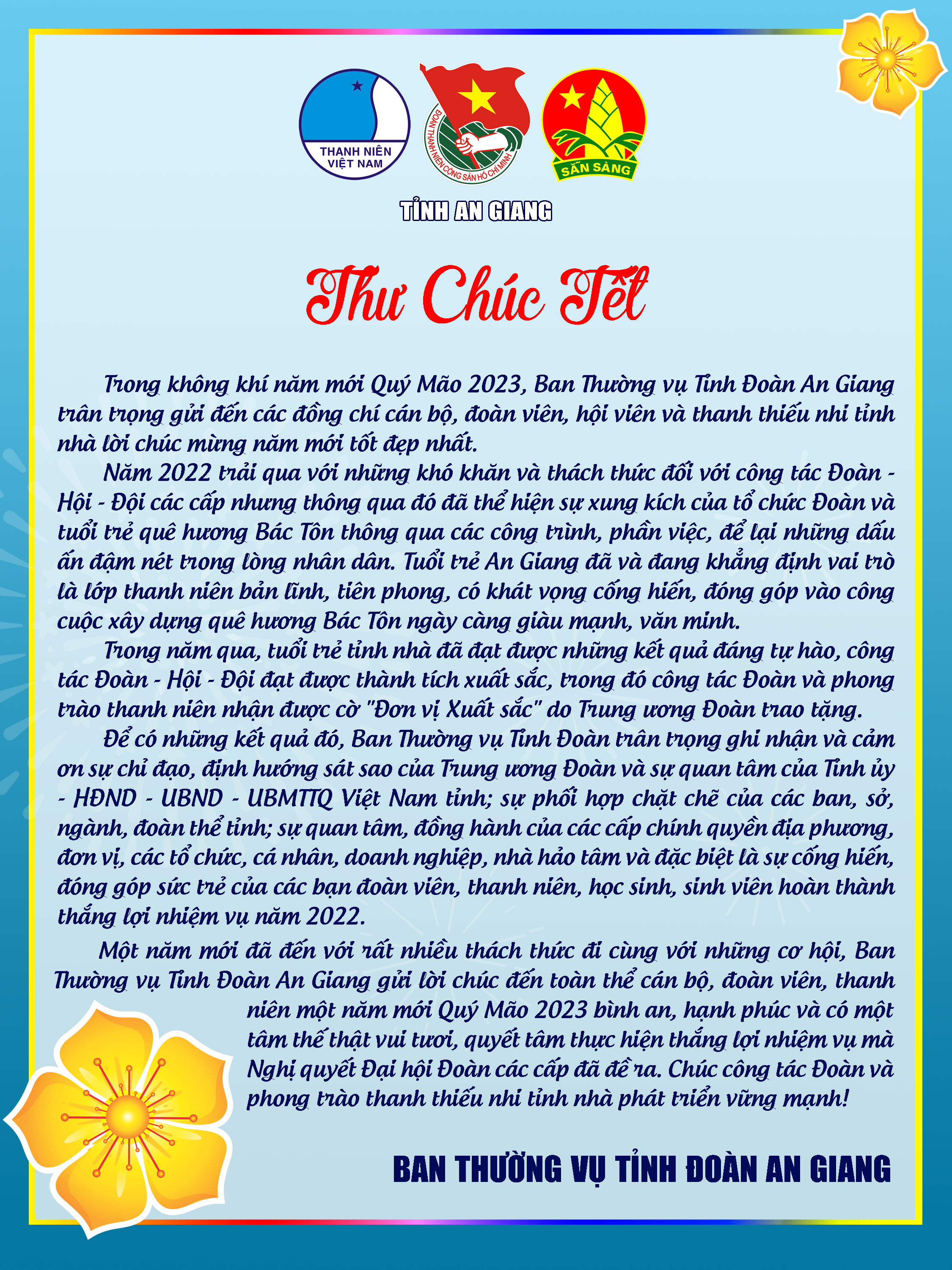 Một năm mới đã đến với rất nhiều thách thức đi cùng với cơ hội, Ban Thường vụ Tỉnh Đoàn An Giang gửi lời chúc đến toàn thể cán bộ, đoàn viên, thanh niên, học sinh, sinh viên một năm mới Quý Mão 2023 bình an, hạnh phúc và có một tâm thế thật vui tươi, quyết tâm thực hiện thắng lợi Nghị quyết Đại hội Đoàn các cấp đã đề ra.