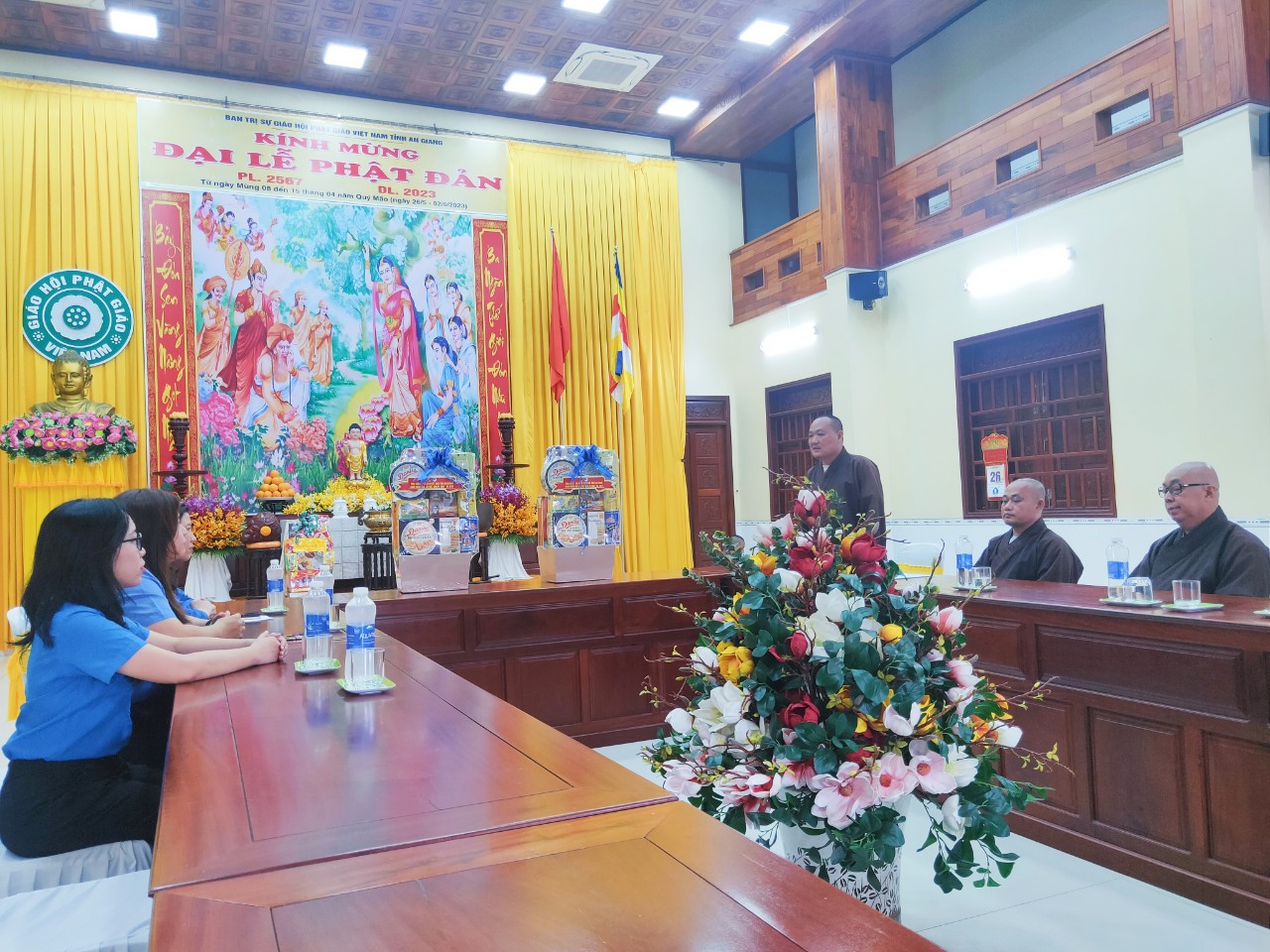 Thượng tọa Thích Viên Quang - Ủy viên Hội đồng Trị sự, Phó Trưởng ban kiêm Chánh Thư ký Ban Trị sự Giáo hội Phật giáo Việt Nam tỉnh An Giang đón tiếp và gửi lời cảm ơn sâu sắc trước sự quan tâm, động viên, chúc mừng của Tỉnh Đoàn - Hội LHTN Việt Nam tỉnh nhân dịp Đại lễ Phật đản 2023 - Phật lịch 2567. Đồng thời, hứa sẽ tiếp tục hưởng ứng các hoạt động an sinh xã hội, giúp đỡ người nghèo, thanh niên có hoàn cảnh khó khăn, đóng góp tích cực vào sự phát triển kinh tế - xã hội địa phương.