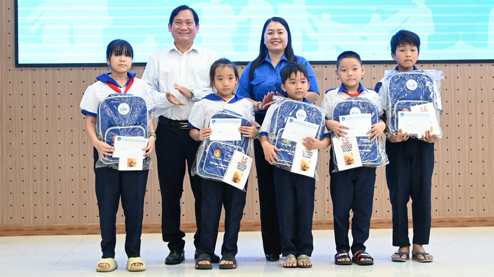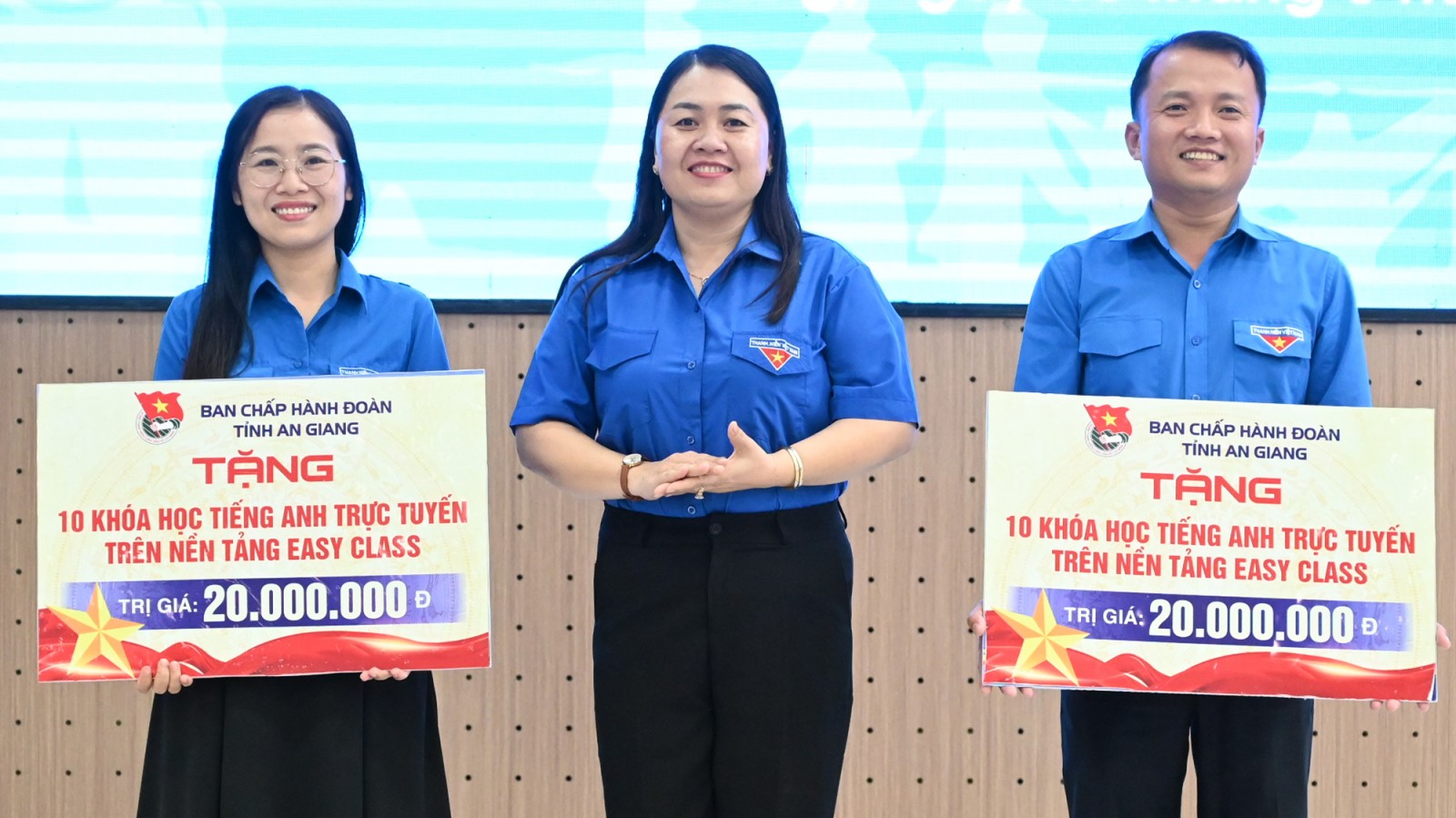 Phó Bí thư Thường trực Tỉnh đoàn, Trưởng ban Công tác Đoàn và Thanh thiếu nhi Cơ quan Ủy ban Mặt trận Tổ quốc Việt Nam tỉnh An Giang Thị Phương Hồng trao bảng tượng trưng học bổng tiếng Anh cho đại diện các phường