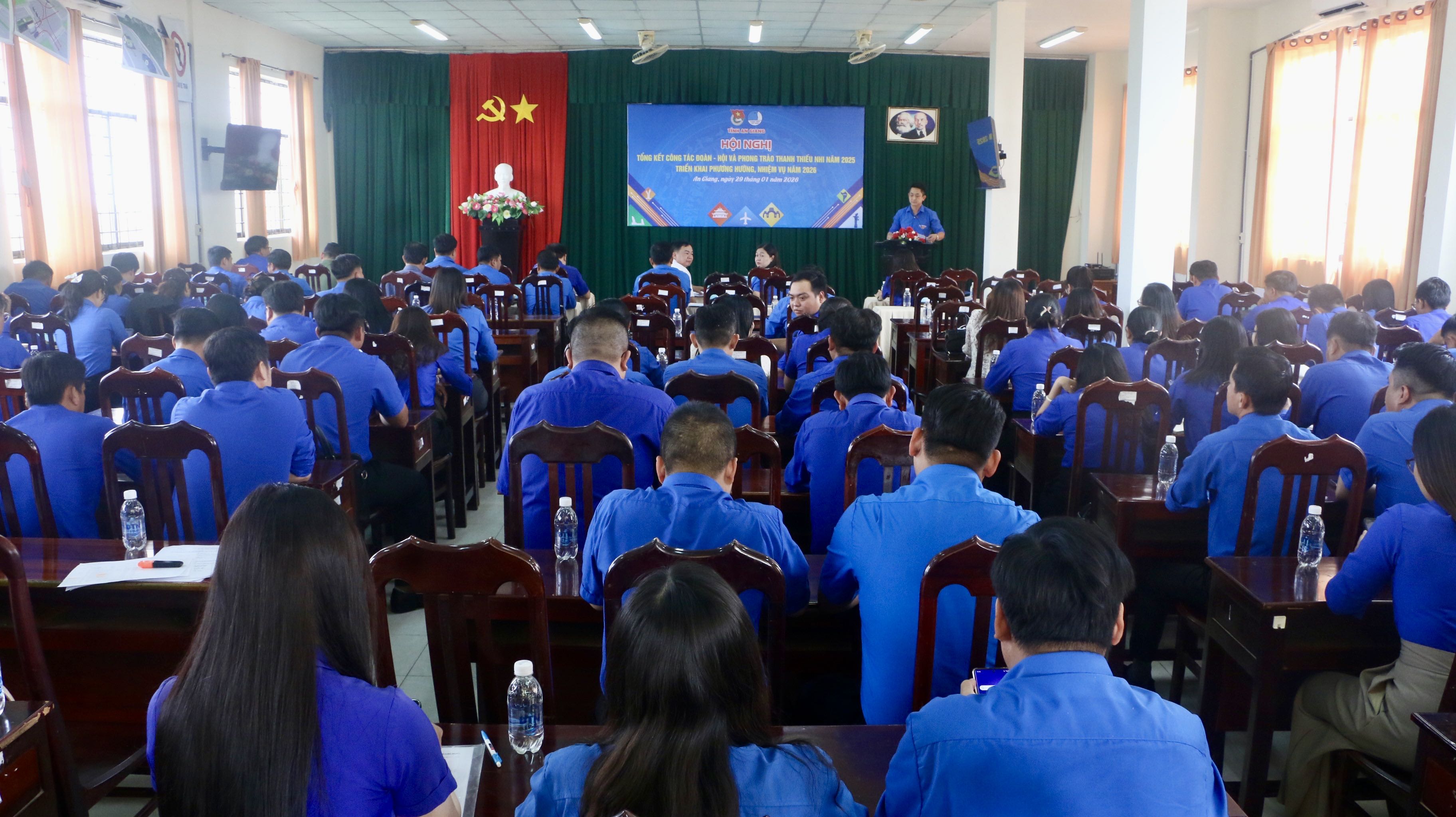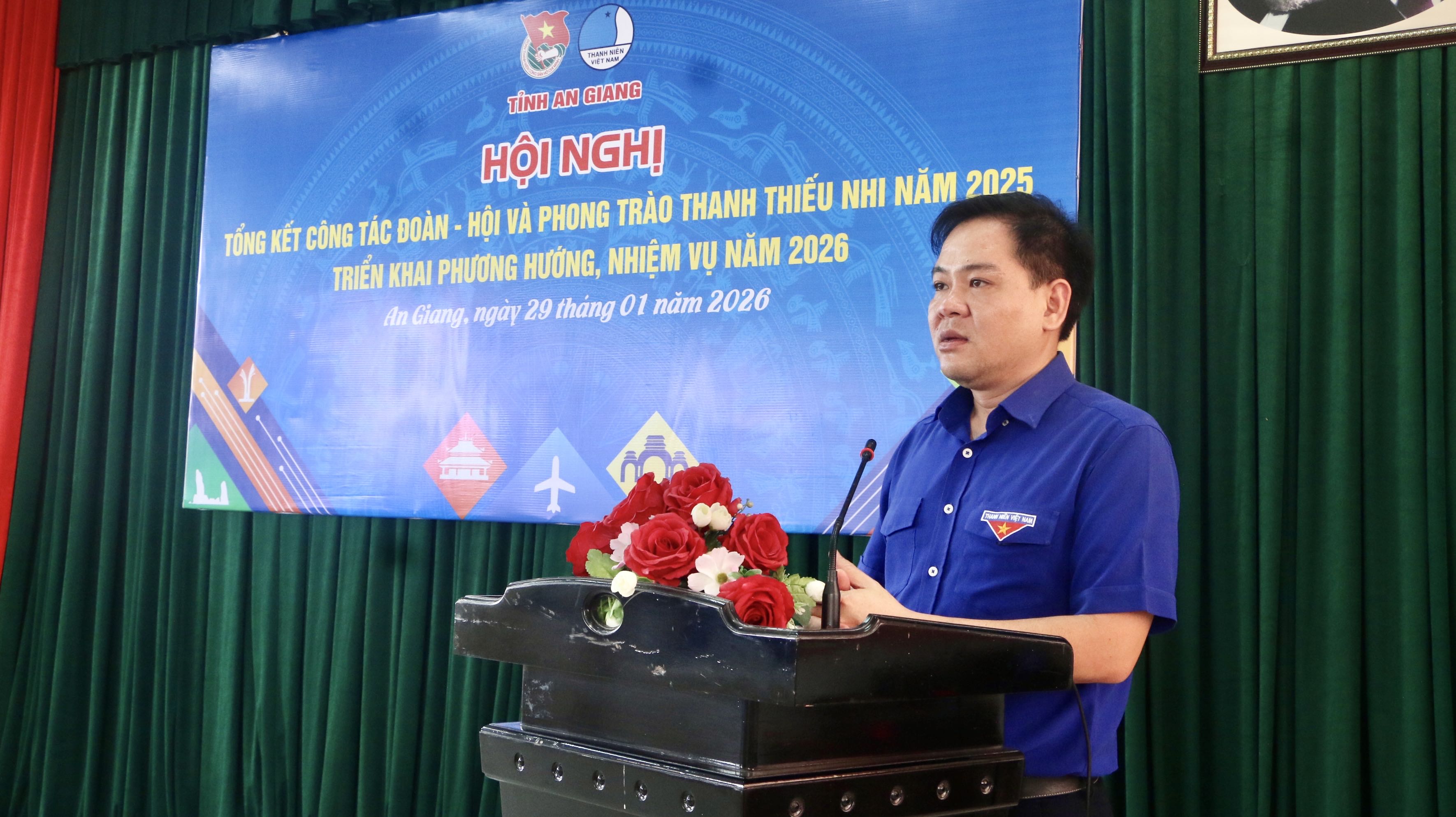 Phát biểu tại hội nghị tổng kết và triển khai nhiệm vụ, đồng chí Phan Duy Bằng - Phó Chủ tịch Ủy ban Mặt trận Tổ quốc Việt Nam tỉnh, Bí thư Tỉnh đoàn nhấn mạnh: Năm 2025 là năm có nhiều dấu ấn đặc biệt với tổ chức Đoàn, Hội, Đội tỉnh An Giang khi hòa nhịp cùng toàn hệ thống chính trị thực hiện sáp nhập địa giới hành chính, thực hiện chính quyền địa phương hai cấp. Cũng trong năm 2025, Đại hội Đoàn các cấp nhiệm kỳ 2025 - 2030 được tổ chức thành công, mở đầu cho một giai đoạn phát triển mới, tạo khí thế thi đua sôi nổi trong toàn Đoàn. Công tác Đoàn, Hội và phong trào thanh thiếu nhi của tỉnh qua một năm với nhiều biến động, vượt qua những khó khăn, thách thức, gặt hái nhiều kết quả quan trọng.