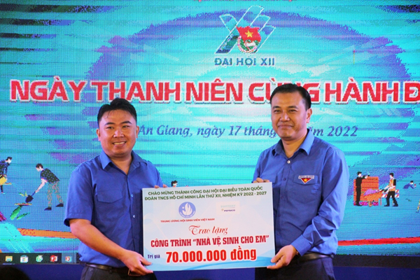 Đồng chí Nguyễn Hải Minh (bên phải) – Phó Chủ tịch thường trực Trung ương Hội LHTN Việt Nam trao tặng các công trình trong lễ phát động hưởng ứng tại An Giang